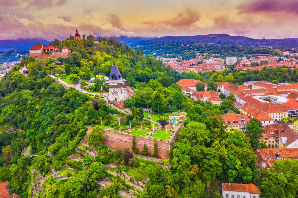 Грац – второй после Вены. В смысле по величине, что никак не сказалось на его провинциальном очаровании. Чтобы не выглядеть совсем умильно, Грац придумал себе скалу посреди города и возвел на ней замок – замок Шлоссберг. От замка до наших дней дошли живописные развалины и часовая башня – символ города. У подножия замковой горы раскинулся знаменитый Старый город с барочными фасадами и площадью Колокольного звона. Одно название многого стоит, а также часовая башня Глокеншпиль – три раза в день ее створки распахиваются и деревянные фигурки мальчика и девочки кружатся под колокольный звон.