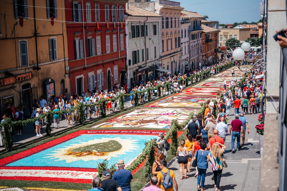 Благоухающие цветочные картины выкладывают на библейские или исторические сюжеты - в ход идут разноцветные лепестки цветов, ягоды и листья растений. Получаются впечатляюще ковры длиной в три километра - их рассматривают жители Дженцано-ди-Рома в средневековых одеждах и туристы.