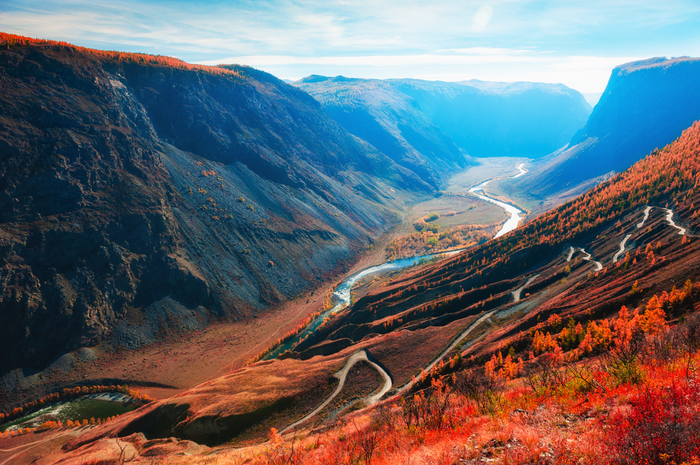 Продолжение переезда (~30 км) по грунтовой дороге к перевалу Кату-Ярык (1200 м). Со смотровой площадки на высшей точке перевала открываются потрясающие виды: извивающаяся узкой лентой река Чулышман, на противоположной стороне ущелья — Чулышманское нагорье, обрывающееся в долину высокими отвесными скальными стенами. Спуск по перевалу осуществляется пешком, а багаж спускается на автотранспорте.